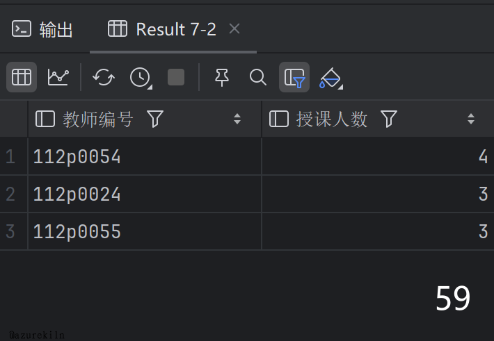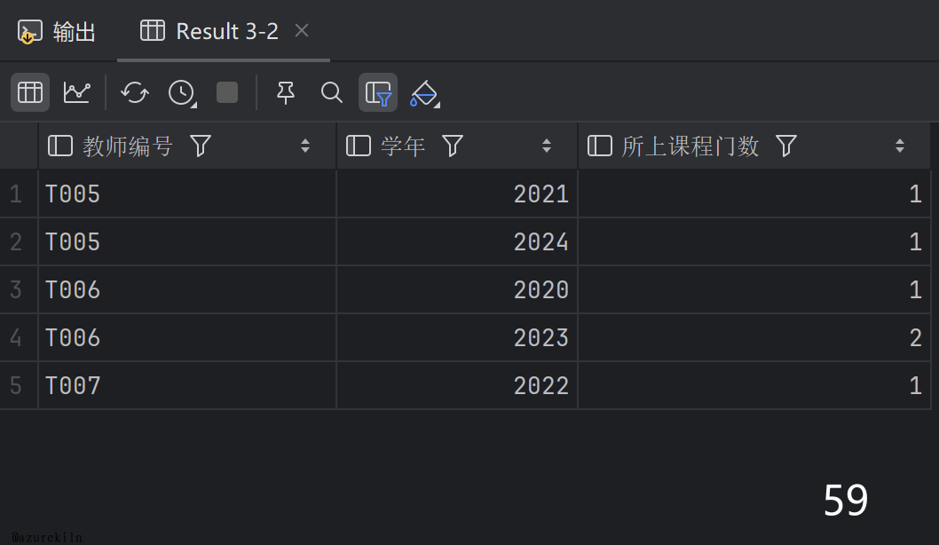 请写出下列查询操作的SQL语句:“查询2023学年至少上了2门课程的教师信息,结果显示教师编号、学年、所上课程门数,按教师编号升序排序,并用中文显示属性列名”USE jxdb59; SELECT Tno AS '教师编号', Tacademicyear AS '学年', COUNT(DISTINCT Cno) AS '所上课程门数' FROM tutors59 WHERE Tacademicyear='2023' GROUP BY Tno, Tacademicyear HAVING COUNT(DISTINCT Cno)>=2 ORDER BY Tno;