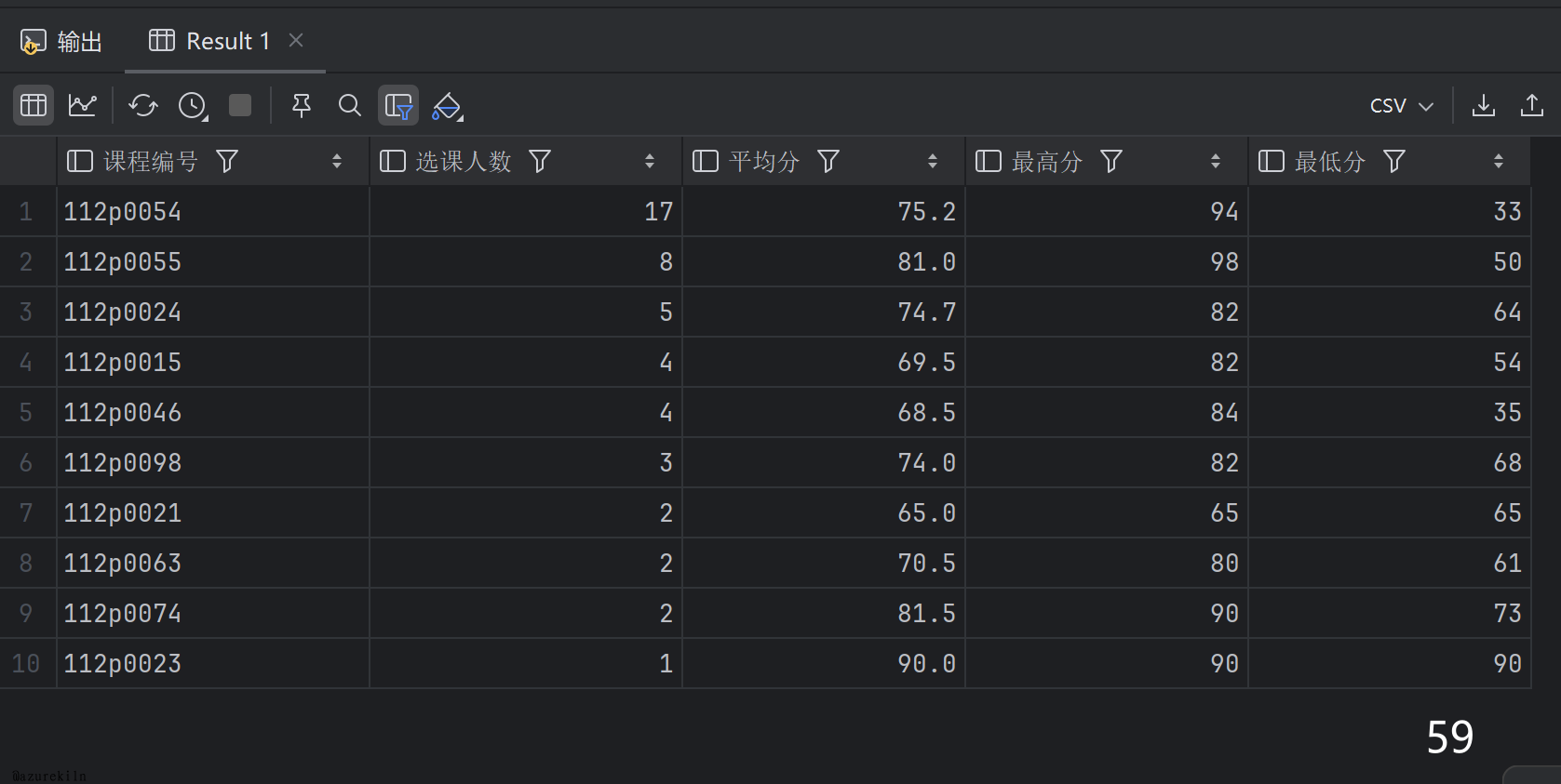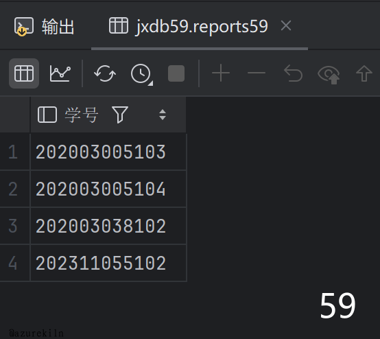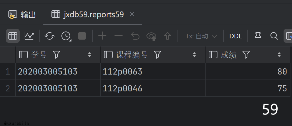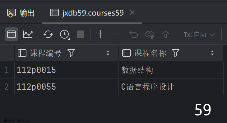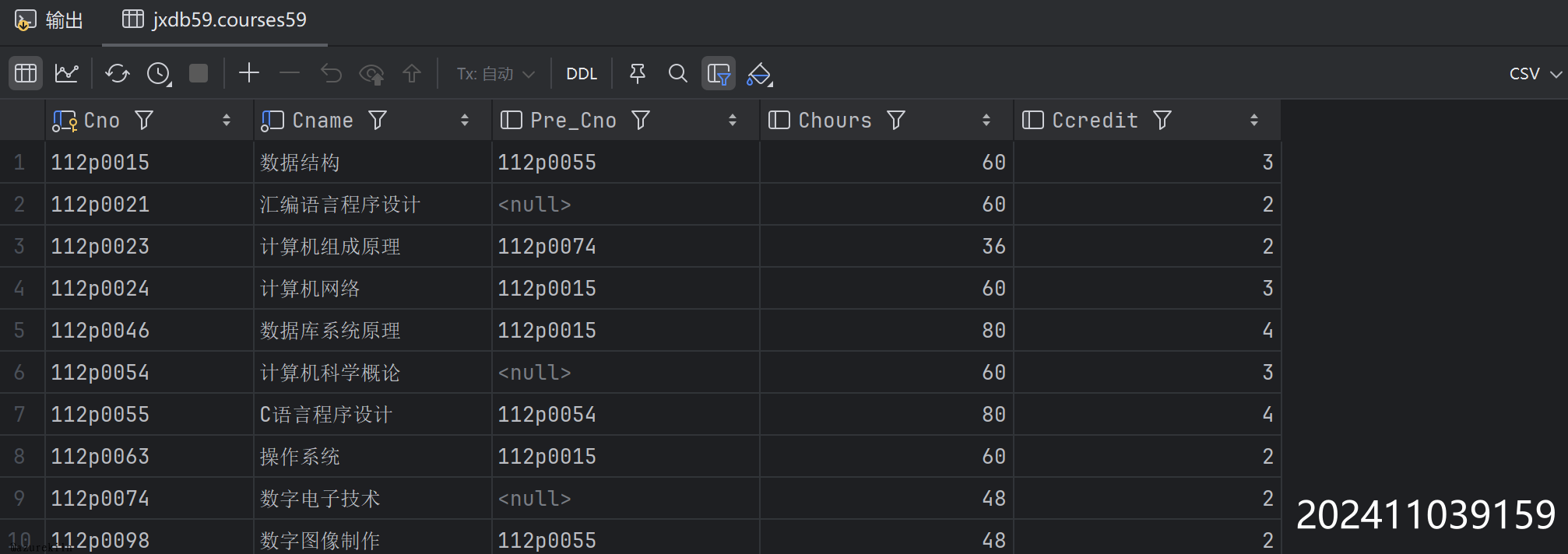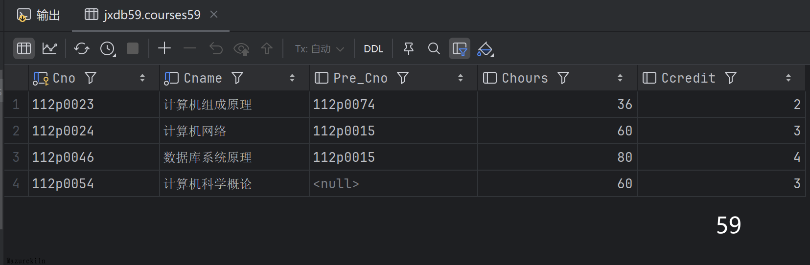 (2)将查询结果截图,截图的右下角要求标上你的学号最后两位。USE jxdb59; SELECT * FROM courses59;