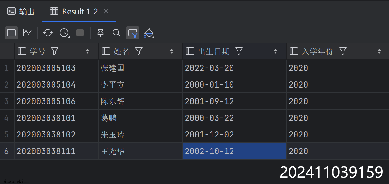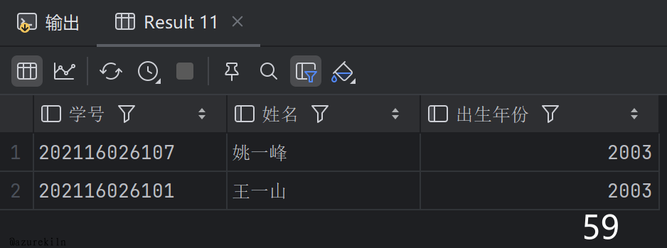 请写出下列查询操作的SQL语句:“查询学生表中前6位学生的学号、姓名、出生日期以及入学年份,查询结果用中文显示列名”USE jxdb59; SELECT Sno AS '学号', Sname AS '姓名', Sbirth AS '出生日期', LEFT(Sno, 4) AS '入学年份' FROM students59 LIMIT 6;