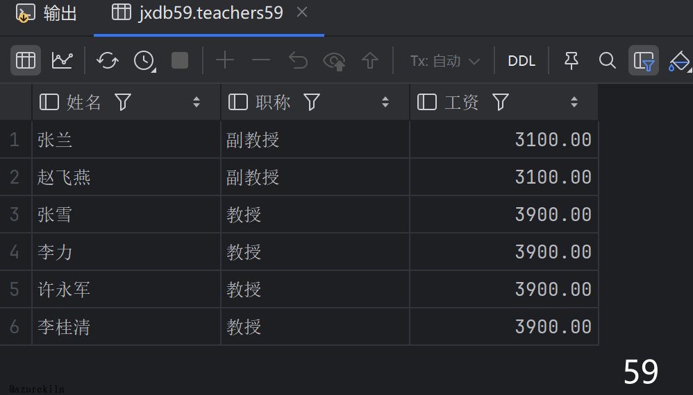 请写出下列查询操作的SQL语句:“查询工资(Tsal)在3000元(含3000元)以上的教师的姓名、职称和工资,查询结果按照工资升序排序”USE jxdb59; SELECT Tname AS '姓名', Tprof AS '职称', Tsal AS '工资' FROM teachers59 WHERE Tsal>=3000 ORDER BY Tsal;