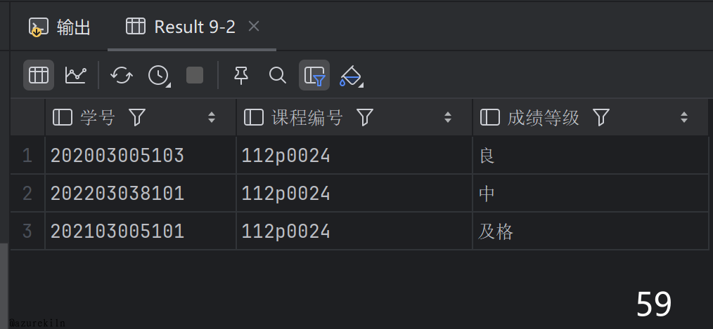 请写出下列查询操作的SQL语句:“查询所有选修了课程号为112p0024并且有成绩的学生的考试情况,结果要求显示学生的学号、课程号和成绩等级('优'、'良'、'中、'及格'和'不及格),并按成绩降序排序(提示:CASE WHEN)”USE jxdb59; SELECT Sno AS '学号', Cno AS '课程编号', CASE WHEN grade >= 90 THEN '优' WHEN grade >= 80 THEN '良' WHEN grade >= 70 THEN '中' WHEN grade >= 60 THEN '及格' ELSE '不及格' END AS '成绩等级' FROM Reports59 WHERE Cno = '112p0024' AND Grade IS NOT NULL ORDER BY Grade DESC;