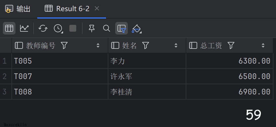 请写出下列查询操作的SQL语句:"用自身连接查询和'王一凡'在同一个学院,且总工资(基本工资Tsal+岗位津贴Tcomm)比'王一凡'高的教师的信息,结果显示教师编号(Tno)、姓名(Tname)和总工资,并用中文显示属性列名"USE jxdb59; SELECT t1.Tno AS '教师编号', t1.Tname AS '姓名', (t1.Tsal + t1.Tcomm) AS '总工资' FROM teachers59 t1, teachers59 t2 WHERE t1.Dno = t2.Dno AND t2.Tname = '王一凡' AND (t1.Tsal + t1.Tcomm) > (t2.Tsal + t2.Tcomm);