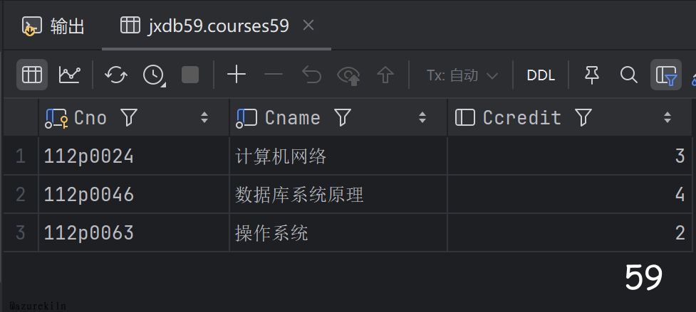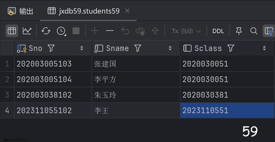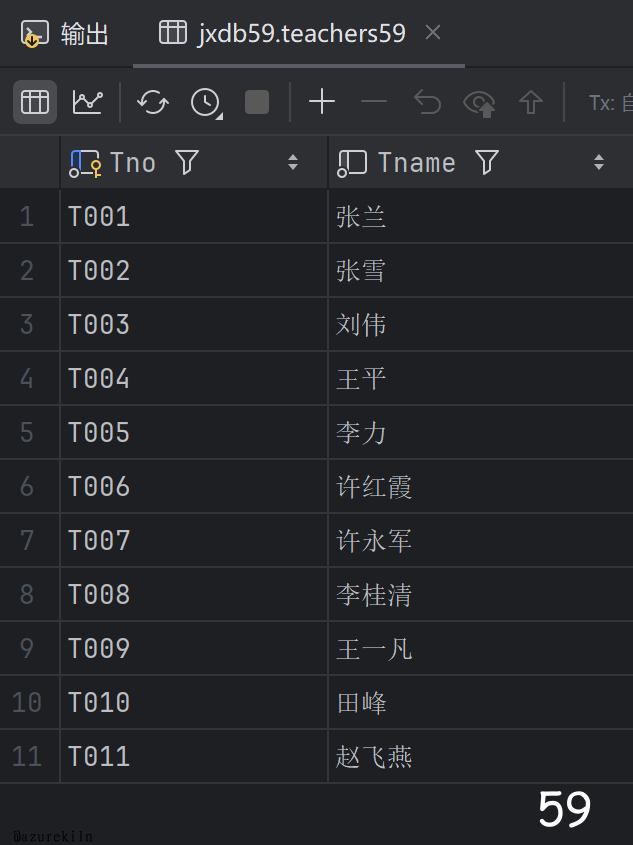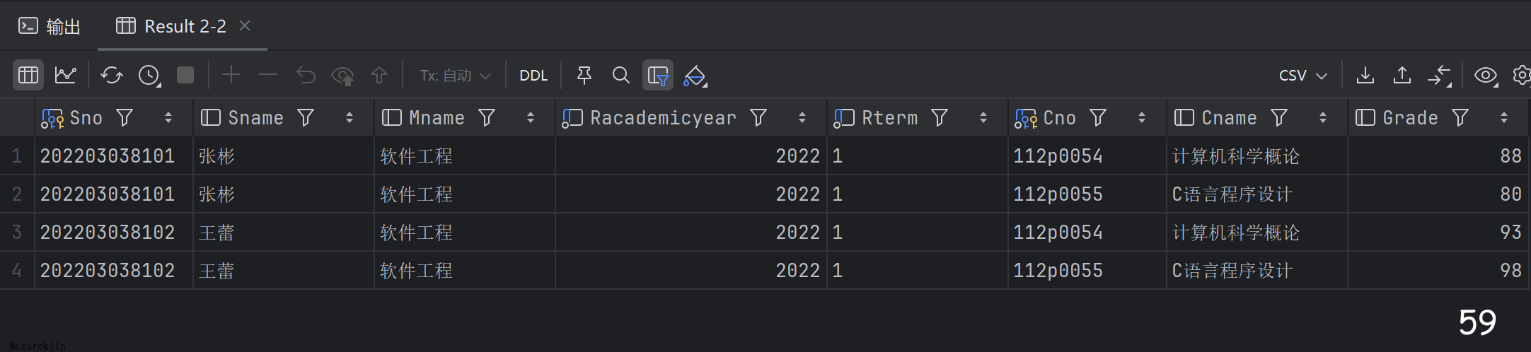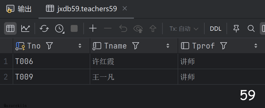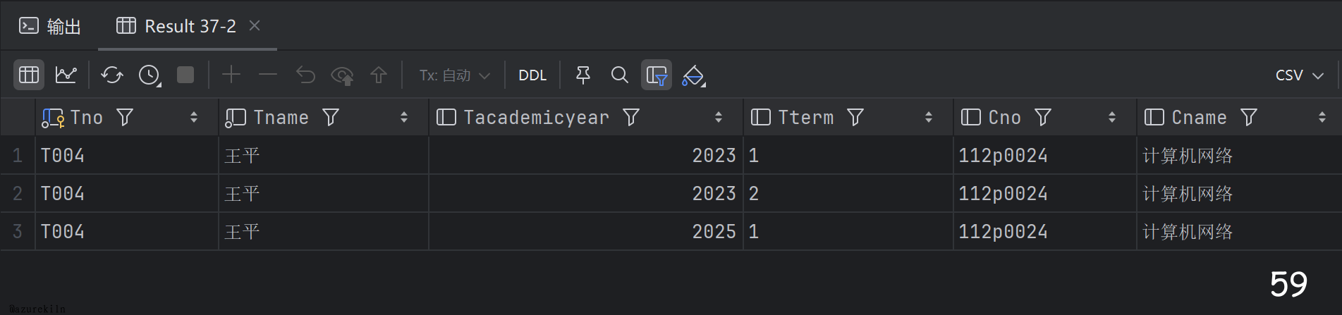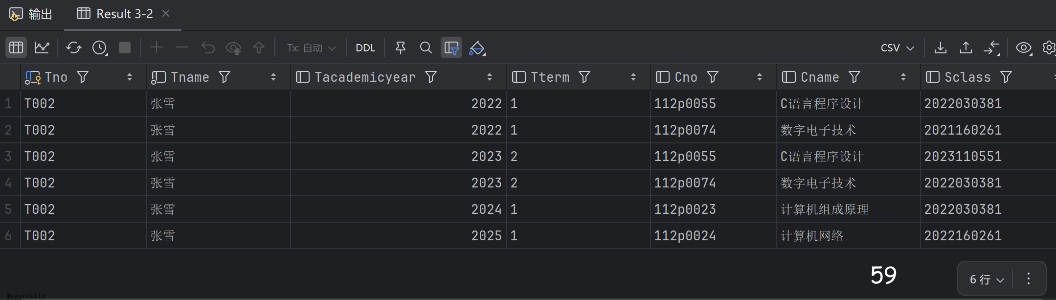请写出下列查询操作的SQL语句:"查询教师张雪的授课信息,查询结果显示教师编号(Tno)、姓名(Tname)、授课学年(Tacademicyear)、授课学期(Tterm)、授课的课程编号(Cno)、课程名(Cname)以及授课班级(Sclass),结果按授课学年、授课学期升序排序"USE jxdb59; SELECT t.Tno, t.Tname, tc.Tacademicyear, tc.Tterm, tc.Cno, C.Cname, tc.Sclass FROM tutors59 tc JOIN teachers59 t ON t.Tno = tc.Tno JOIN courses59 c ON c.Cno = tc.Cno WHERE t.Tname = '张雪' ORDER BY Tacademicyear, Tterm;