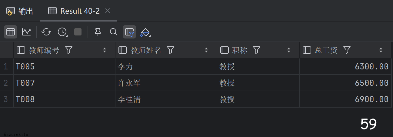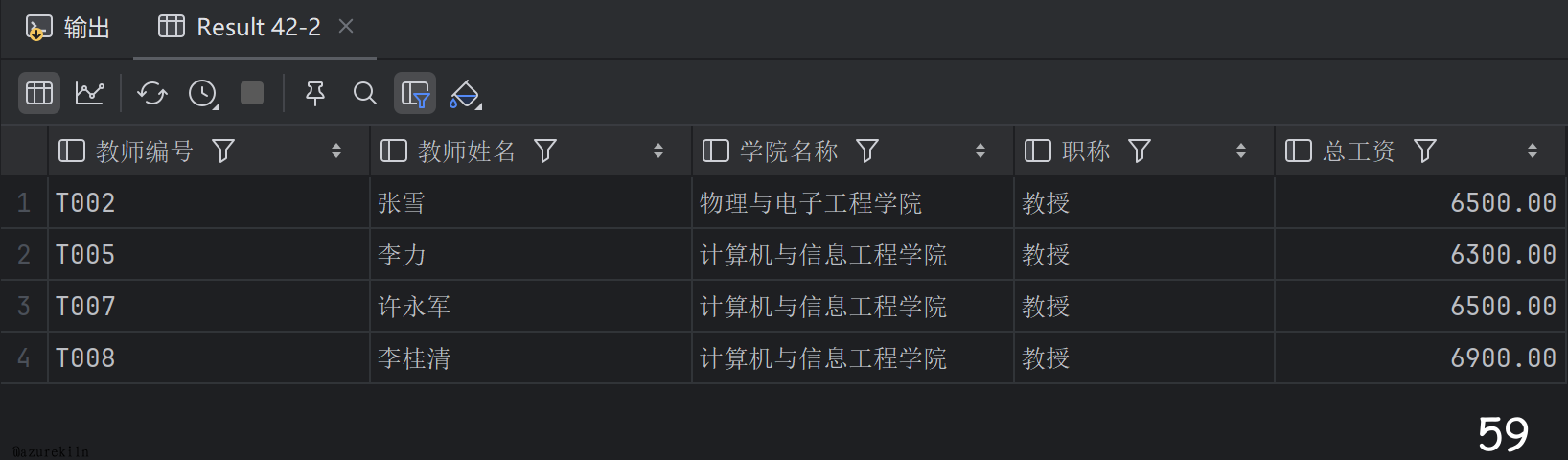 请写出下列查询操作的SQL语句:"使用嵌套查询,查询总工资高于所有学院的平均总工资的教师信息,结果显示教师编号(Tno)、教师姓名(Tname)、学院名称(Dname)、职称(Tprof)及总工资,结果按教师编号升序排序,并用中文显示属性列名" (总工资=工资Tsal+岗位津贴Tcomm)USE jxdb59; SELECT T.Tno AS '教师编号', T.Tname AS '教师姓名', D.Dname AS '学院名称', T.Tprof AS '职称', (T.Tsal + T.Tcomm) AS '总工资' FROM Teachers59 T JOIN Department59 D ON T.Dno = D.Dno WHERE (T.Tsal + T.Tcomm) > ALL ( SELECT AVG(Tsal + Tcomm) FROM Teachers59 GROUP BY Dno ) ORDER BY T.Tno;
